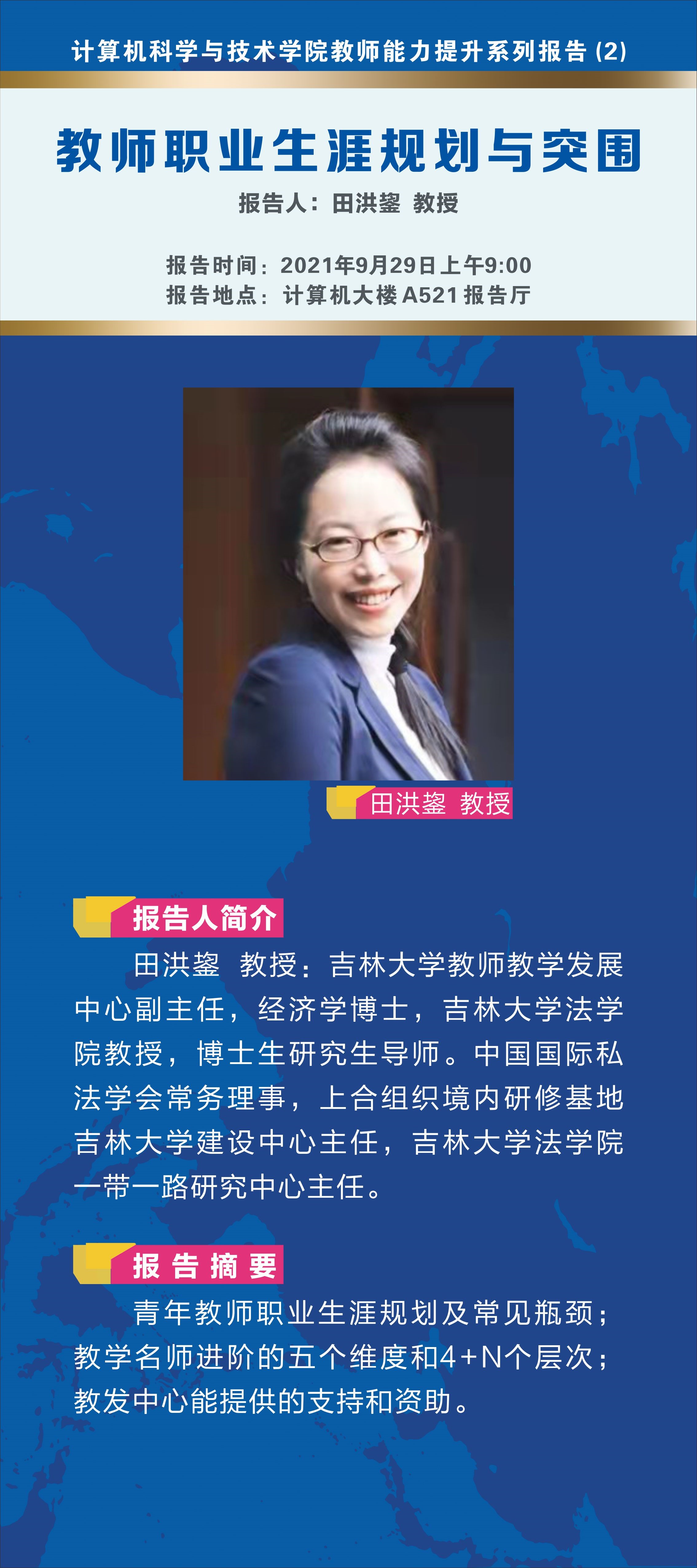 2021年9月29日上午,威廉希尔田洪鋆教授应英国威廉希尔足球官网邀请,在威廉希尔中心校区计算机楼A521报告厅作了题为“教师职业生涯规划与突围”的专题报告,这是计算机学科教师能力提升系列报告的第二场报告,报告由英国威廉希尔足球官网副经理张永刚教授主持,计算机学院、软件学院共30余名教师参加了此次报告会。