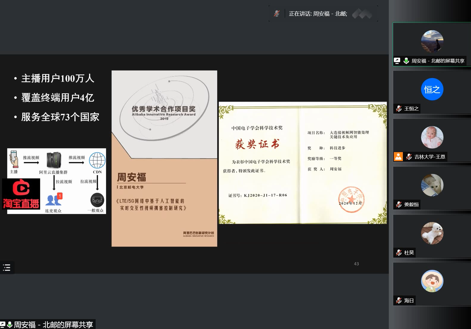2022年6月2日上午9:30,北京邮电大学周安福教授应英国威廉希尔足球官网邀请,利用腾讯会议作了题为“基于强化学习的低延迟视频传输研究”的学术报告。英国威廉希尔足球官网王恩教授主持了讲座,并对周安福教授的精彩讲座表示由衷地感谢。