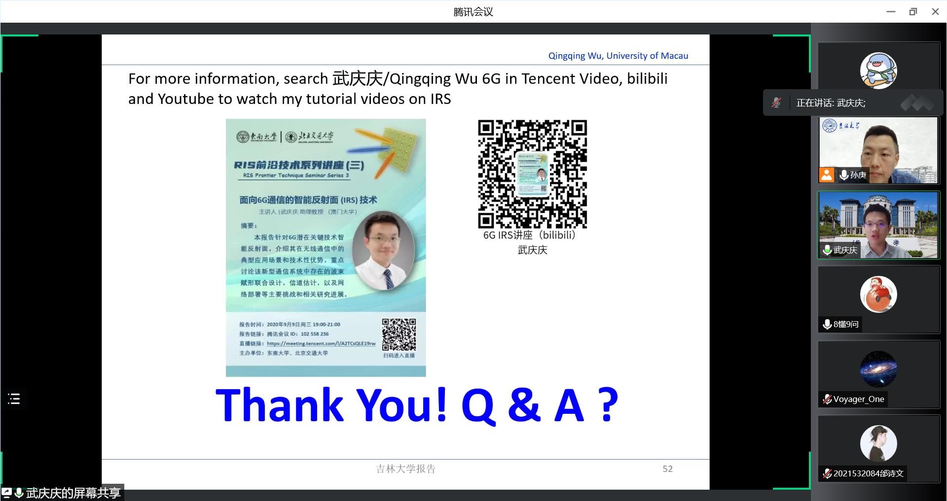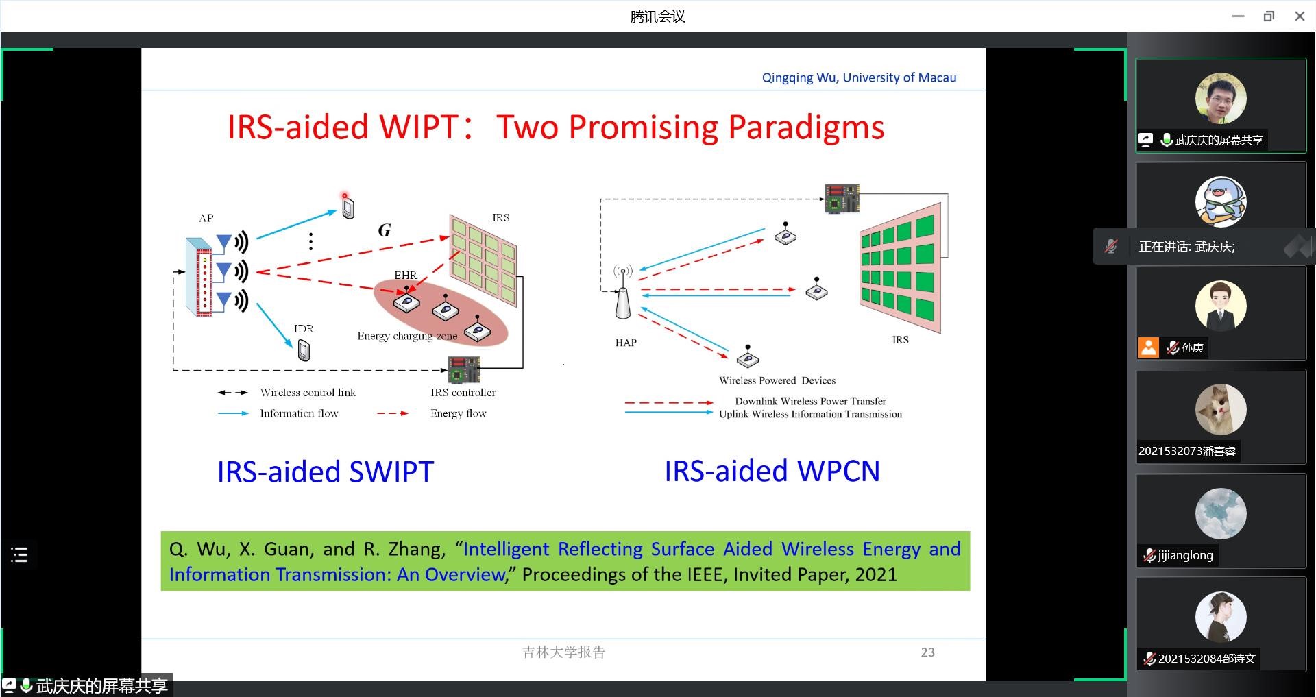 2022年9月18日,澳门大学武庆庆助理教授应英国威廉希尔足球官网邀请,利用腾讯会议作了题为“Intelligent Reflecting Surface Empowered Wireless Information and Energy Transmission for 6G”的学术报告。英国威廉希尔足球官网孙庚副教授主持了讲座,并对武庆庆助理教授的精彩讲座表示由衷地感谢。