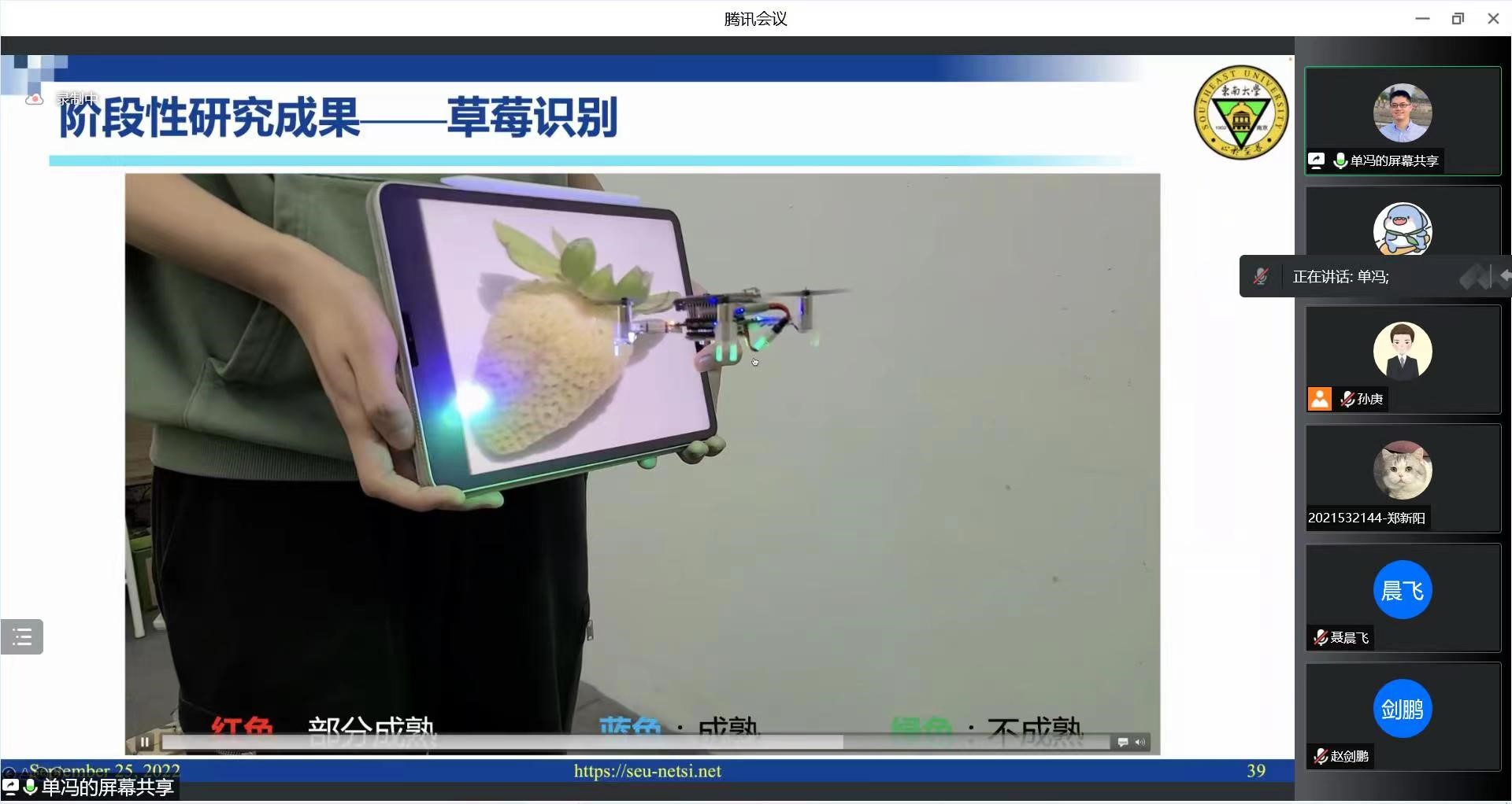 在讲座中,单冯老师首先从无人系统入手,介绍了无人系统研究的浪潮以及无人系统的特点,并简单介绍了无人系统面临的挑战,如组网通信、位置感知、智能计算和自主导航等。随后,单冯老师介绍了基于超宽频无线通信技术的集群测距协议,并展示了团队利用无人机实现草莓识别的阶段性研究成果。此外,单冯老师还介绍了无人机集群自主导航的相关内容。最后,在线师生踊跃提问,单冯老师悉心地解答了相关的问题,本次报告受到了广大师生的热烈响应。